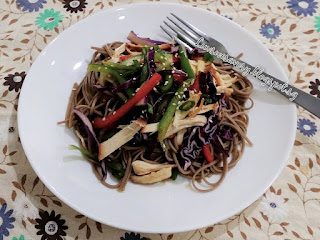 To serve, place some soba noodles on a plate and topped with the chicken salad.